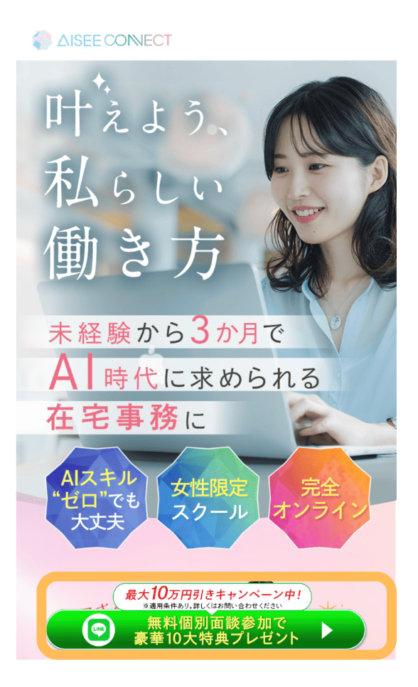 AISEEは女性限定のAI事務専門スクールとして、未経験から3か月で在宅ワーカーを目指せる実践的なカリキュラムを提供しています。