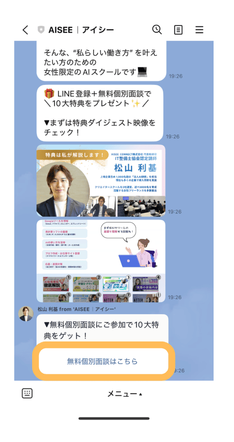 - STEP.3LINEのトークで【無料個別相談はこちら】に進みます。