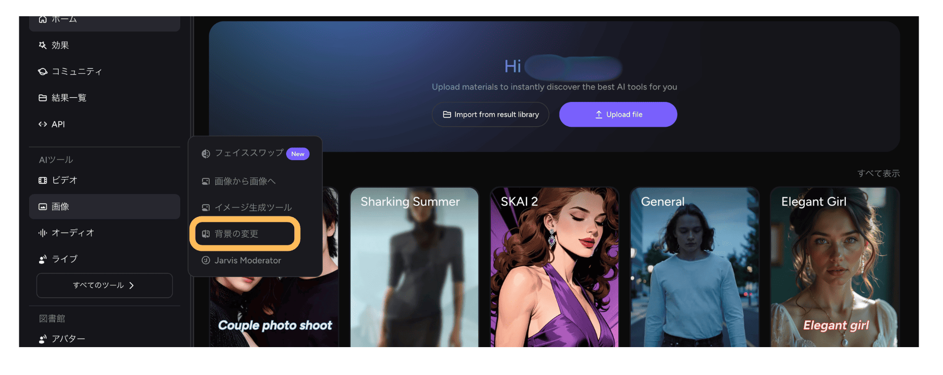 AKOOLのBackground Change(背景変更)は、アップロードした画像の被写体をAIが自動で認識・切り抜きし、背景だけを別の画像に差し替える機能です。