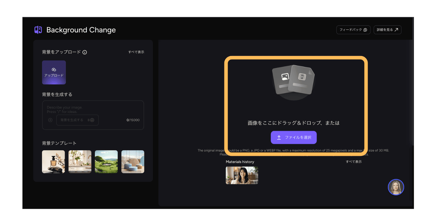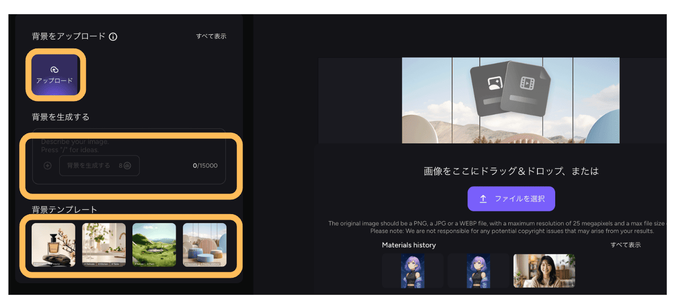 - 自分の画像をアップロード:手持ちの背景画像をそのまま使える