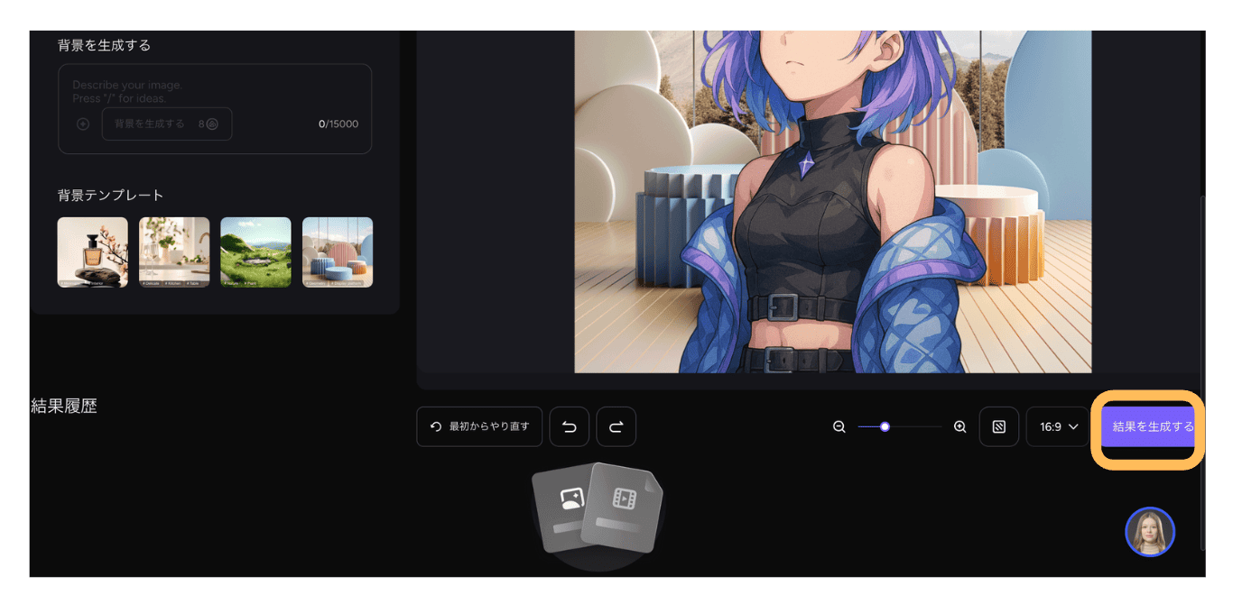 - STEP.3背景を選択する背景の指定方法を選びます。テンプレートから選ぶ場合は、用意されたプリセット背景の中から好みのものをクリックします。自分の背景画像を使いたい場合はアップロード、背景が手元にない場合はAI生成も選べます。