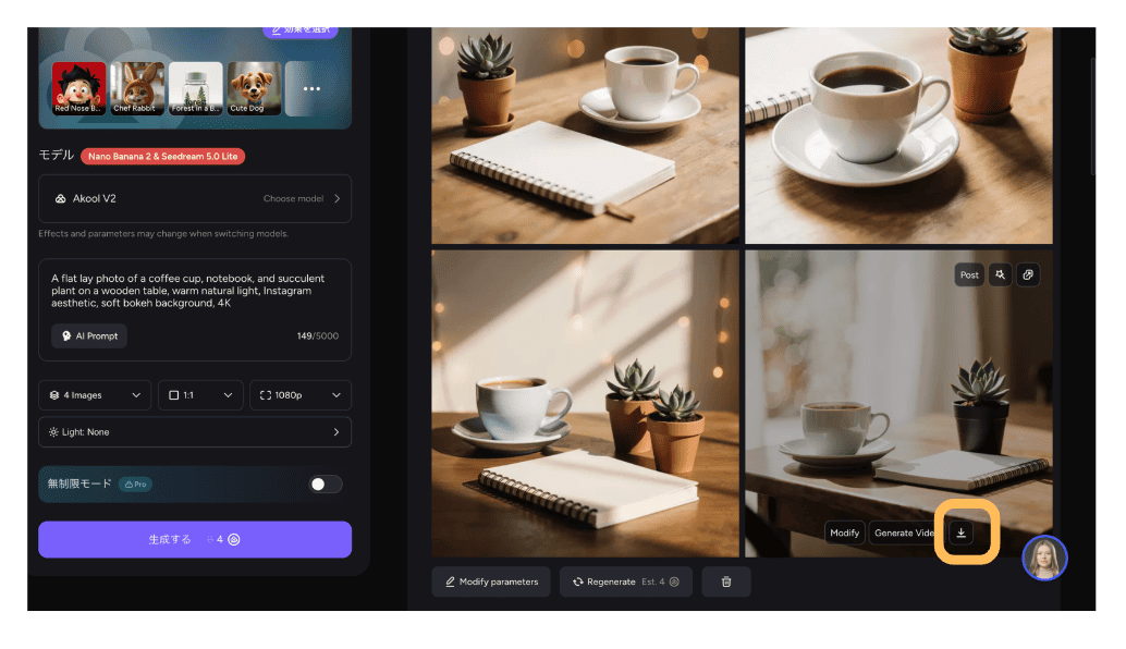 - STEP.4こちらも4枚生成されるので希望のものを保存します。