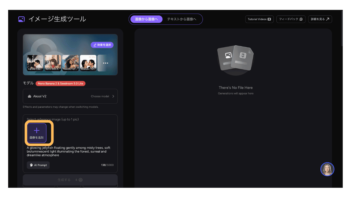 AKOOLのImage Generatorは、テキストや画像からAI画像を手軽に生成できる便利な機能です。