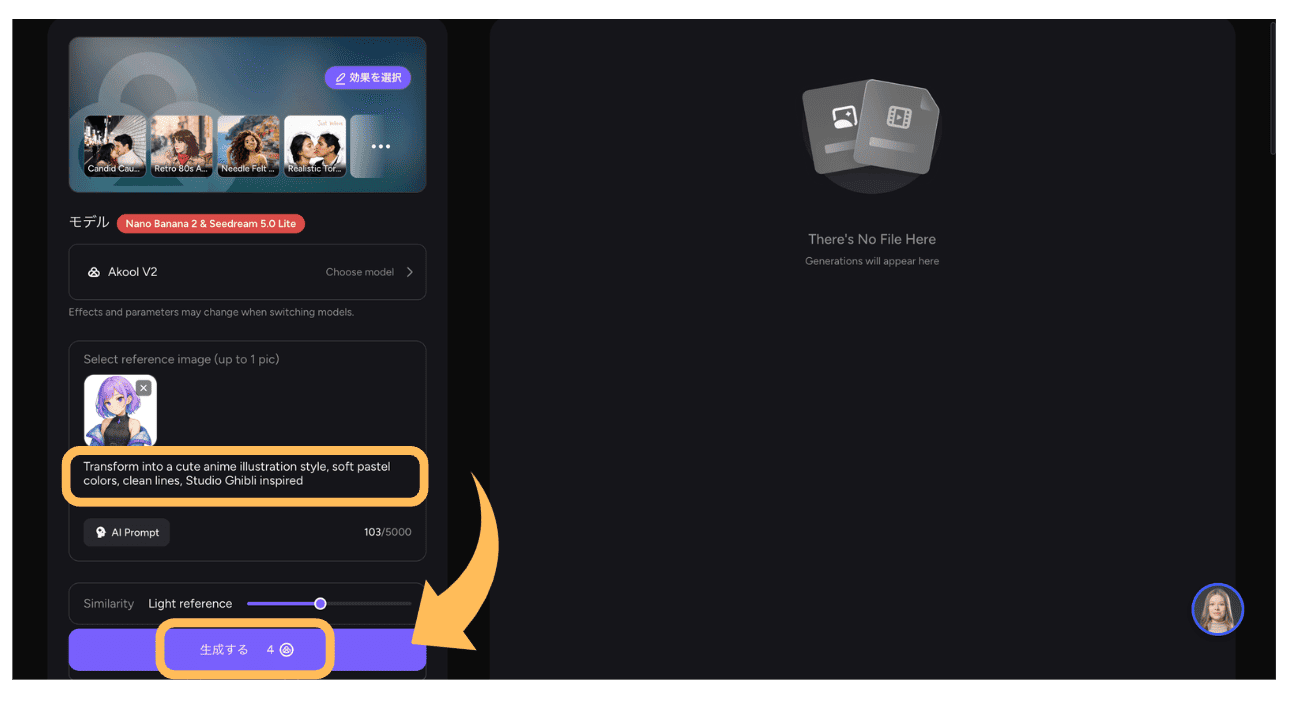 - STEP.3プロンプトを入力します。今回はアニメのキャラクターをリアルな実写版のようにしたかったので【Transform into a photorealistic portrait photo, natural skin texture, studio lighting, DSLR quality】と入力し【生成する】に進みました。