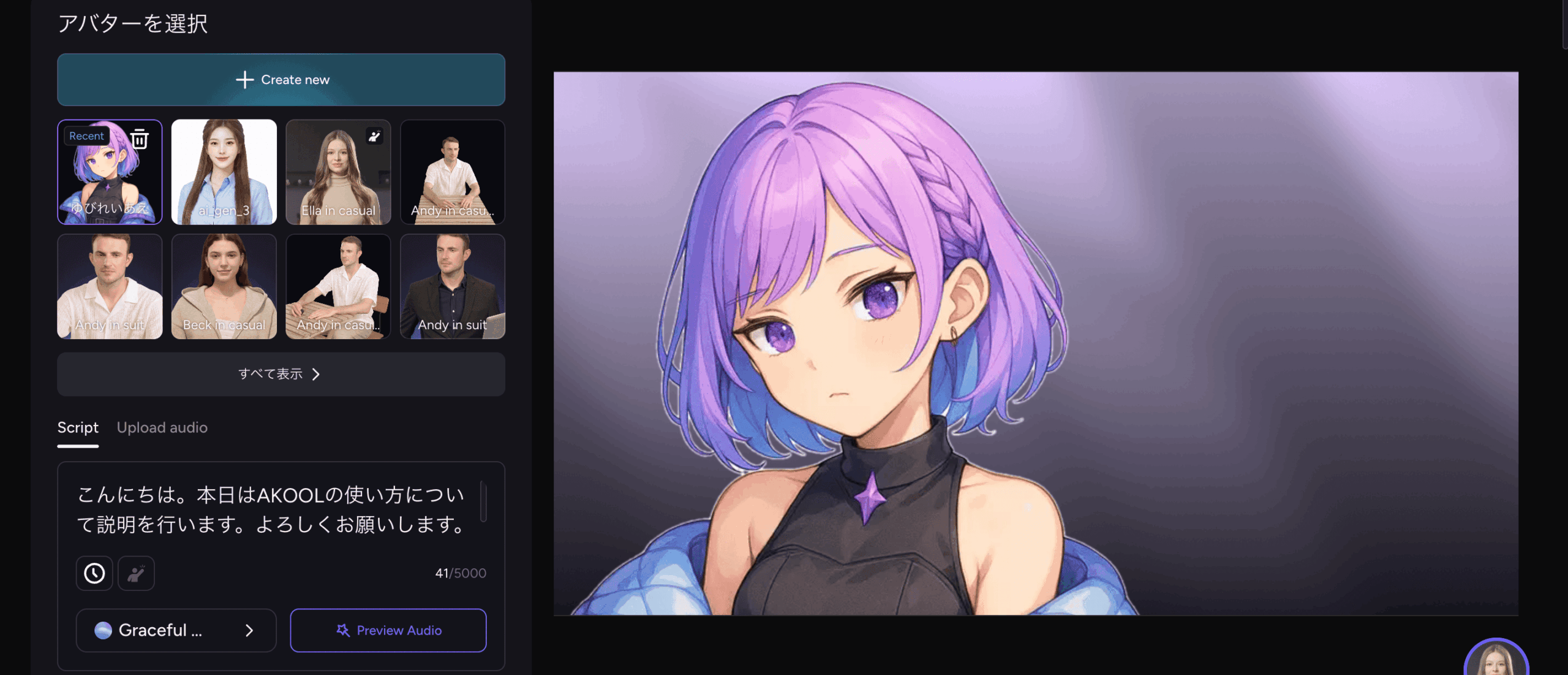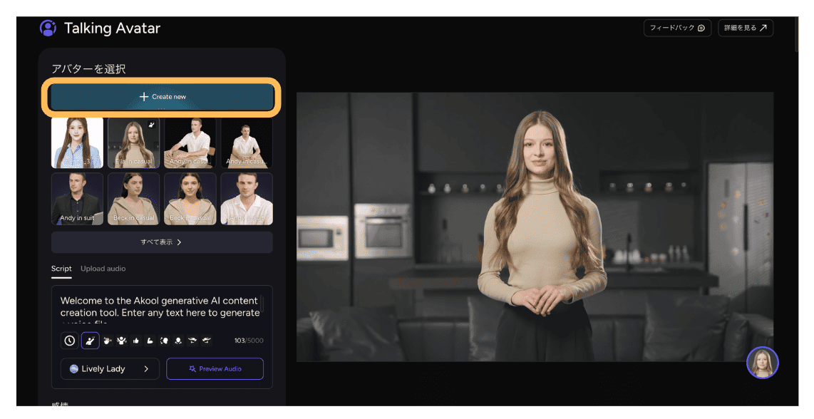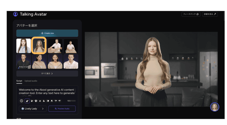 AKOOLのTalking Avatarは、テキストを入力するだけでAIアバターがその内容を話す動画を自動生成してくれる機能です。