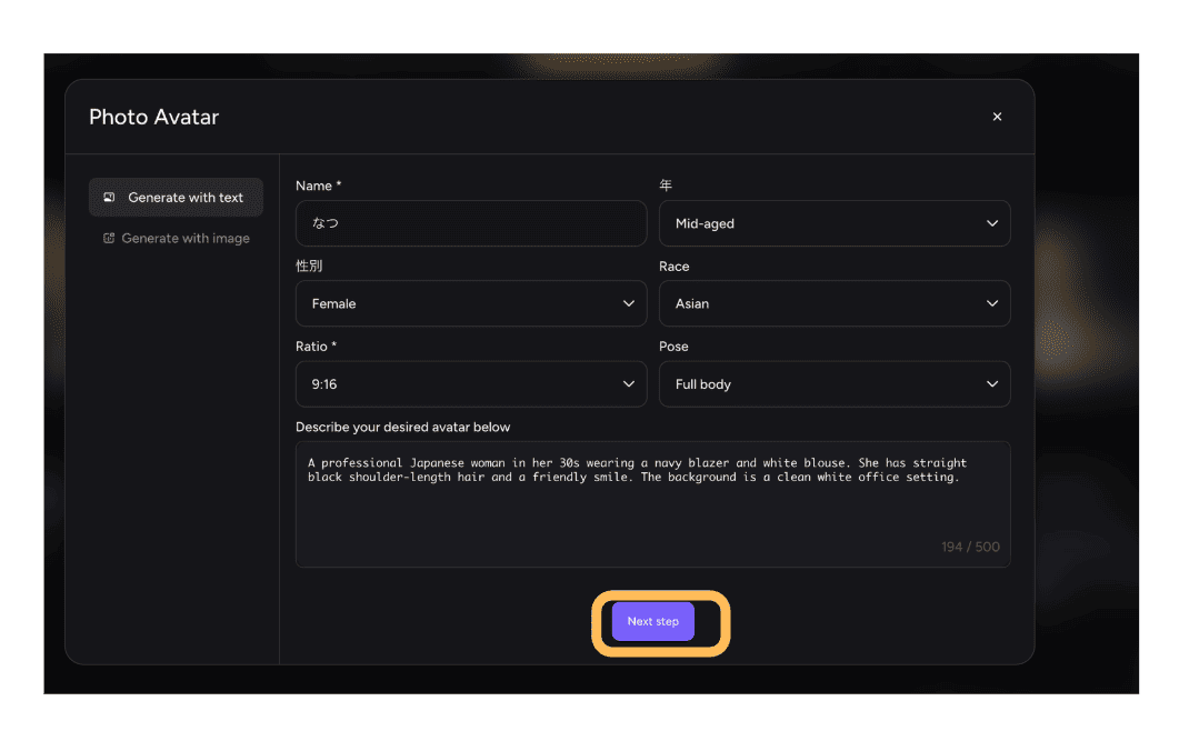 - STEP.3【Generate with text】をクリックしたあと、希望の情報を選択していきます。