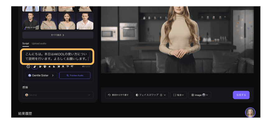 実際にAKOOLのTalking Avatarで動画を生成してみました。