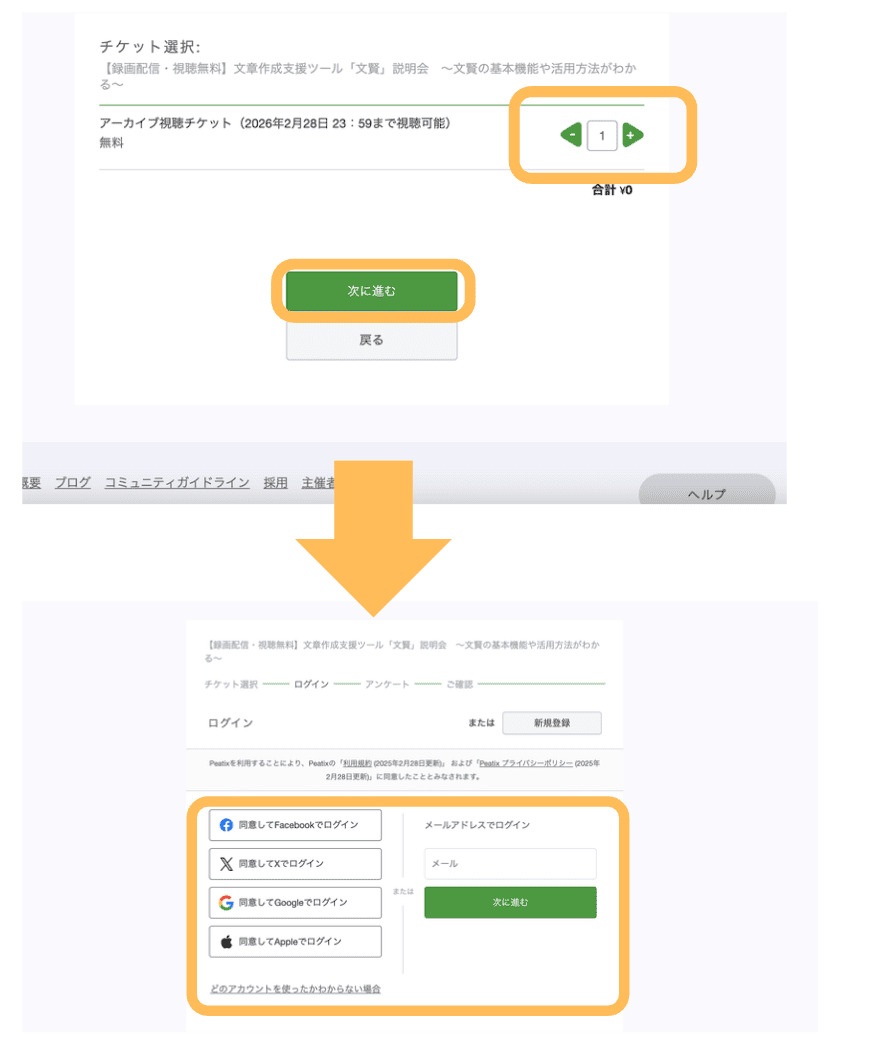 - STEP.3チケットとしてURLが発行されるため、何人が見るか入力し、【次に進む】をクリックします。