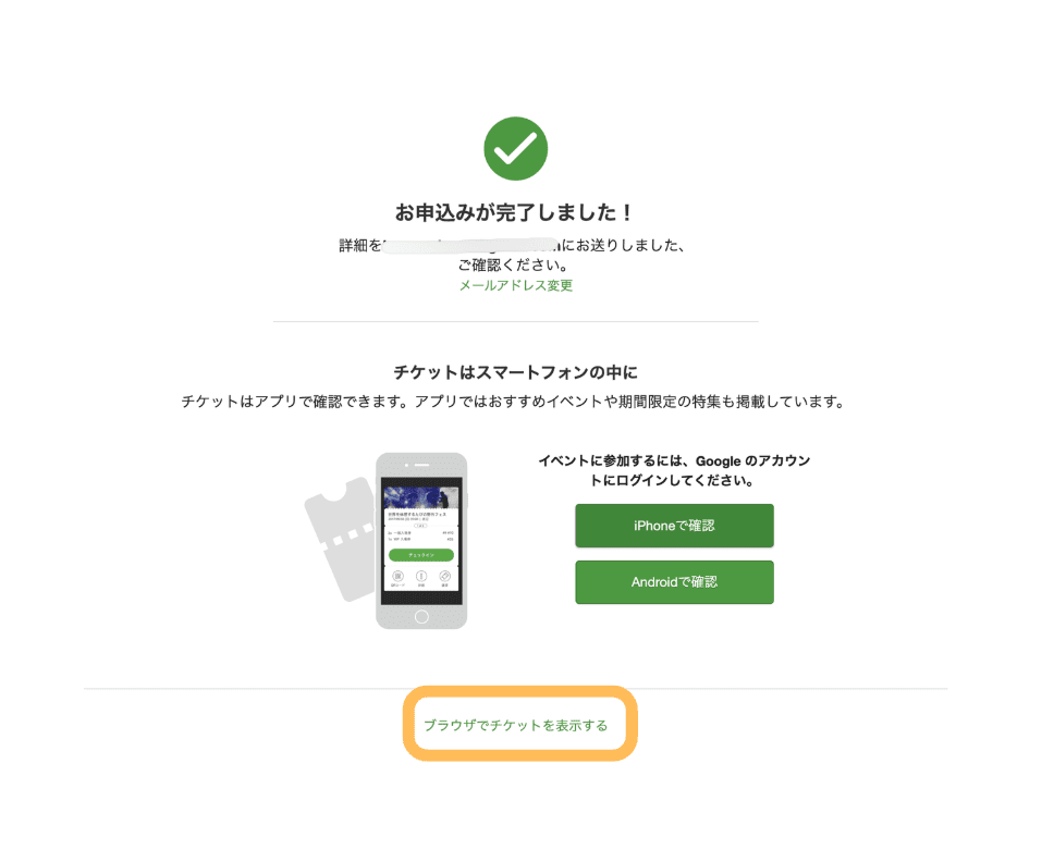 - STEP.5以上で申し込み完了です。スマホアプリで見ることもできますが、ブラウザで見る場合は【ブラウザでチケットを表示する】をクリックします。