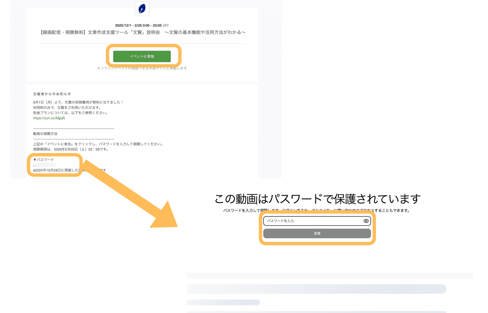 - STEP.6以下の画面になったら先にパスワードをコピーした後に【イベントに参加】をクリックしましょう。
