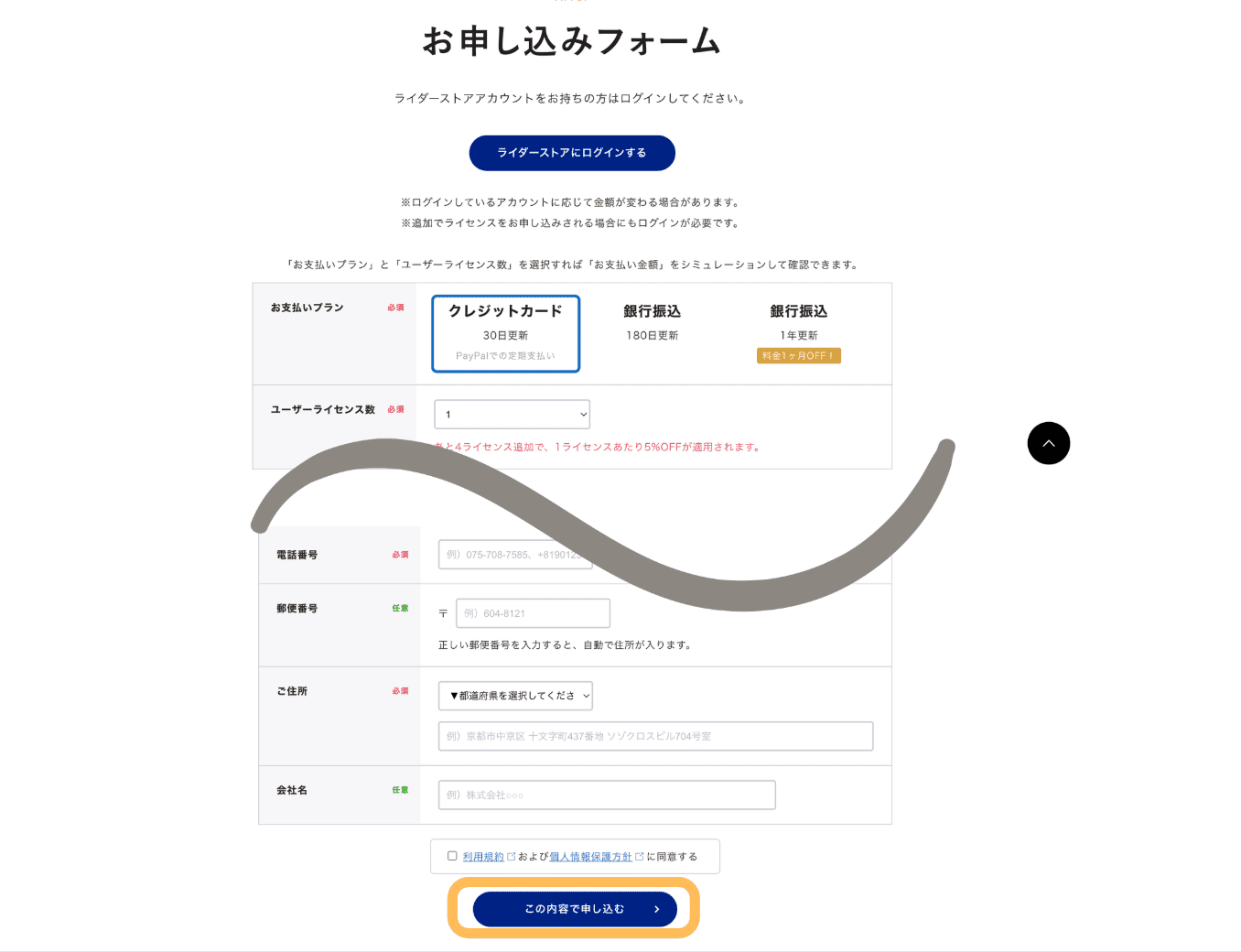- STEP.2支払い方法やその他個人情報の詳細を入力していき【この内容で申し込む】をクリックします。
