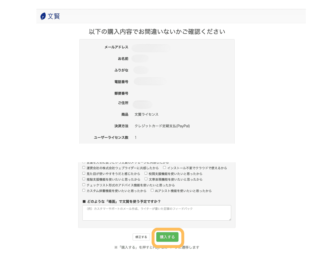 - STEP.3入力した内容が間違いないか確認し【購入する】をクリックします。