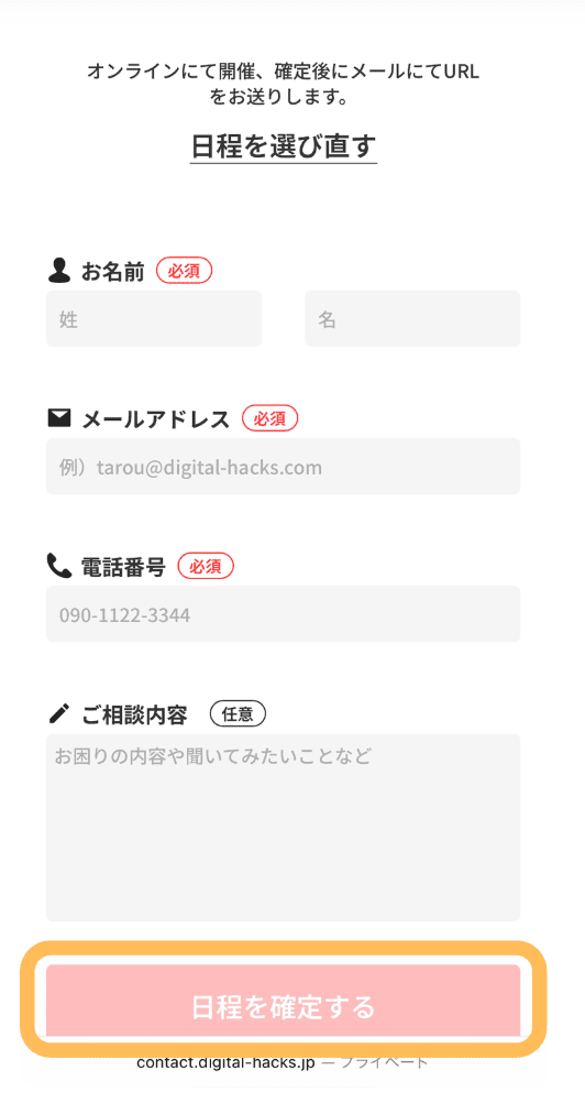 - STEP.3名前、メールアドレス、電話番号を入力し最後に【日程を確定する】をタップします。