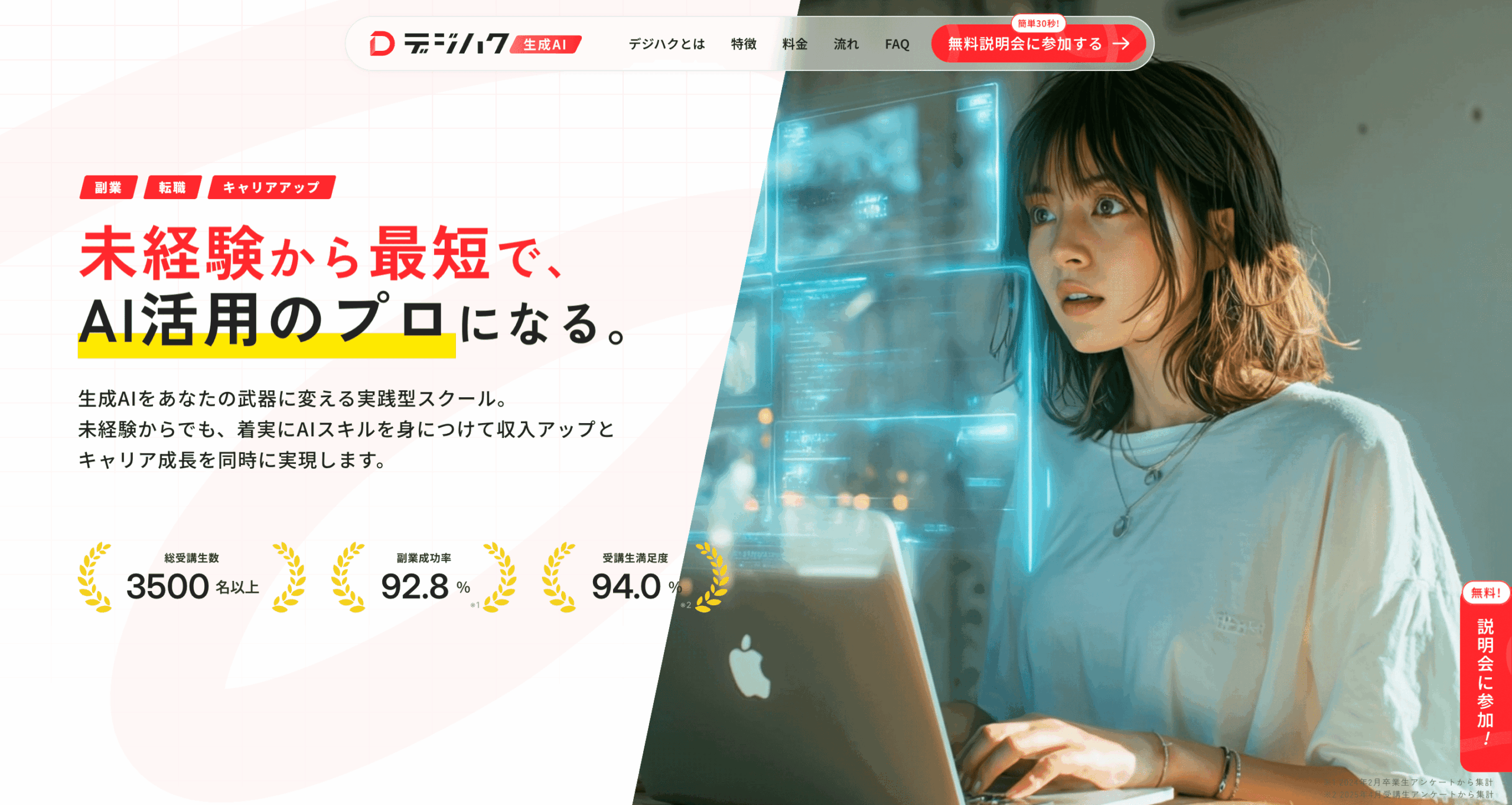 近年、AIスキルや動画編集スキルをオンラインで学べるスクールが急増していますが、その中でも特に話題なのが「デジハク」です。
