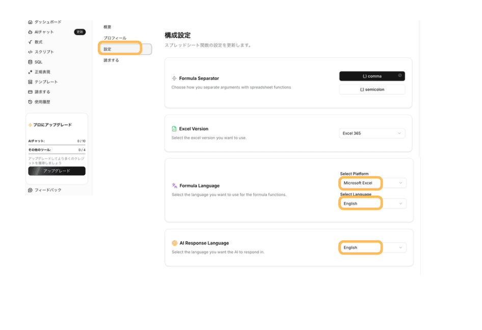 - STEP.4さらに左の【設定】から【Excel or Googleスプレットシート】をクリックし【言語】も2箇所変更します。