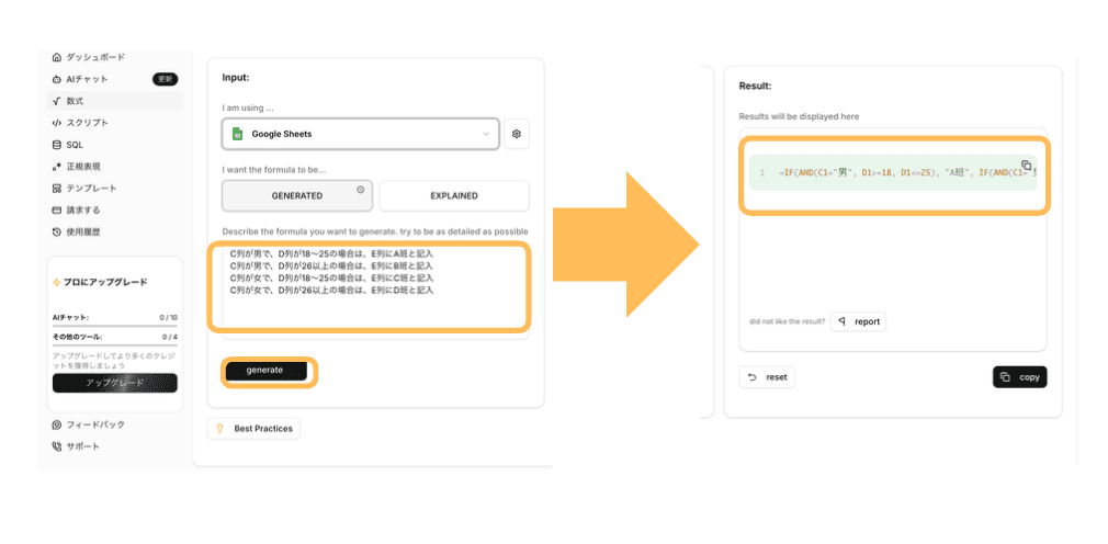 - STEP.2日本語でどのようにしたいか数式を入力し【generate】を押したらすぐに右に関数が表示されるのでコピーします。
