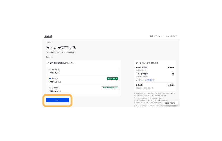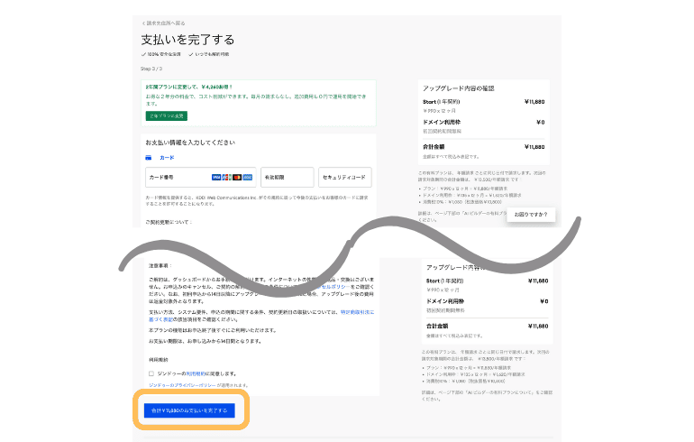 - STEP.5支払いを完了する【次へ】をクリックしたら、独自ドメインを登録することができるようになります。