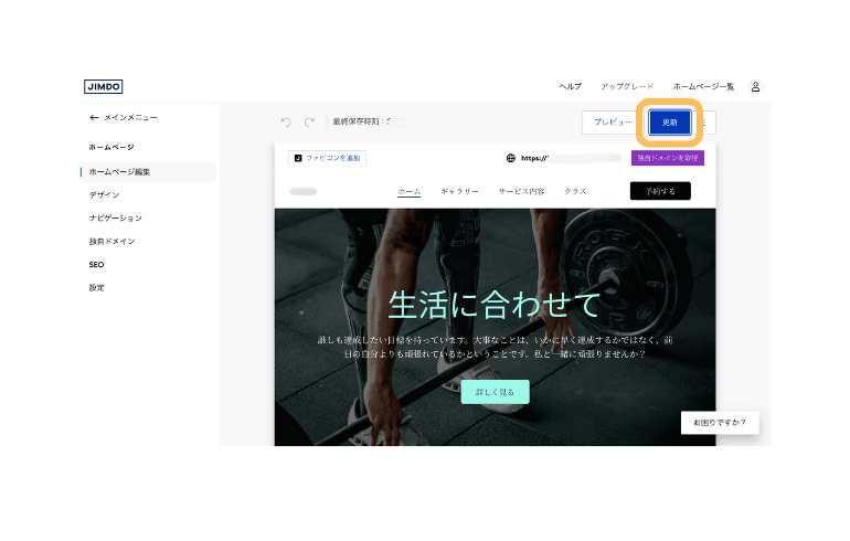 - STEP.6ドメインの登録後、詳細のレイアウトや、詳細の変更を行うことができます。 すべて一旦完了をしたら【更新】をクリックし、ホームページが簡単に作成されます。