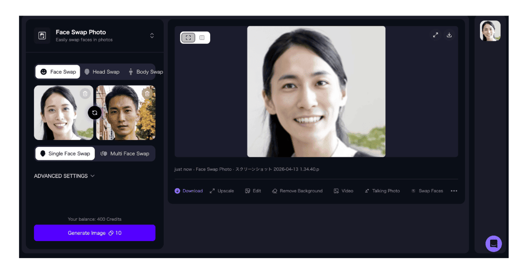 写真1枚をアップロードするだけで、別の写真や動画内の顔をAIが自動で入れ替えてくれます。