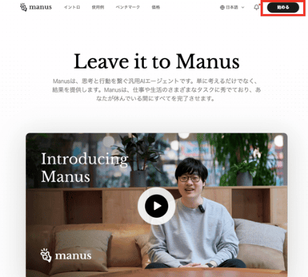 まずは、こちらからmanusの公式サイトにアクセスします。