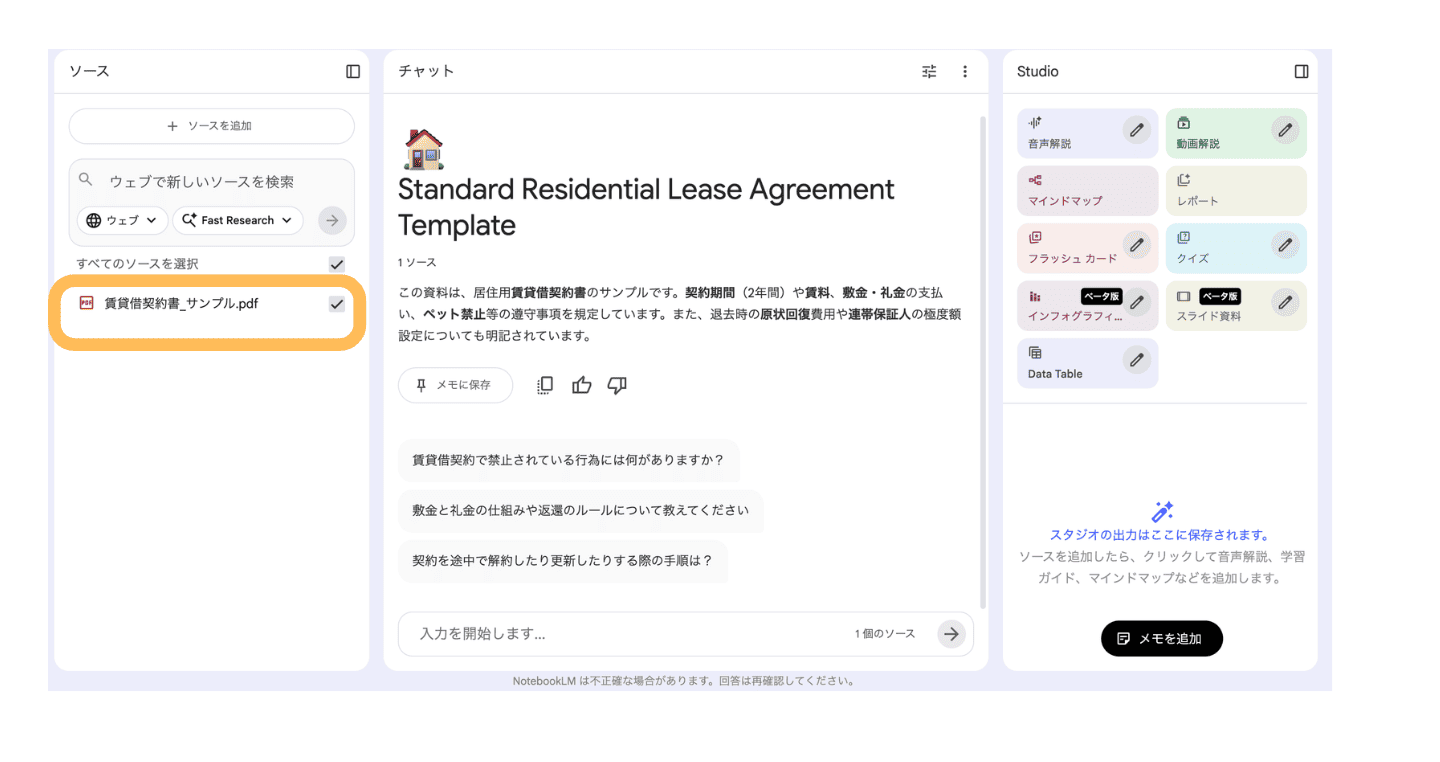 NotebookLMにPDFをアップロードして「リスク要因は何か」「重要な条項を教えて」と質問すれば、該当箇所を的確に抽出してくれます。