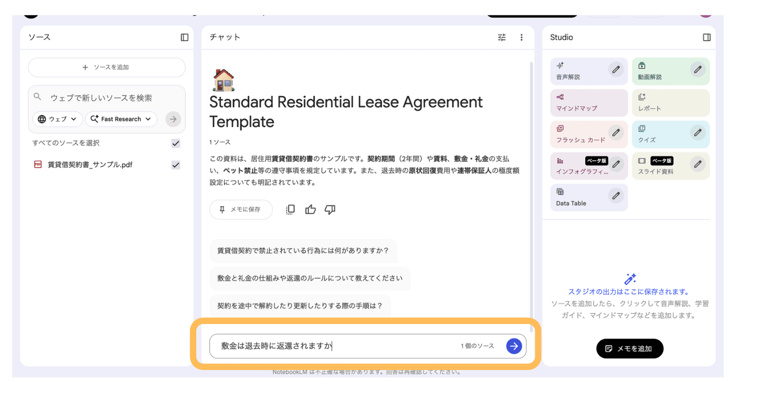 例えば【敷金は退去時に返還されますか】と入力します。