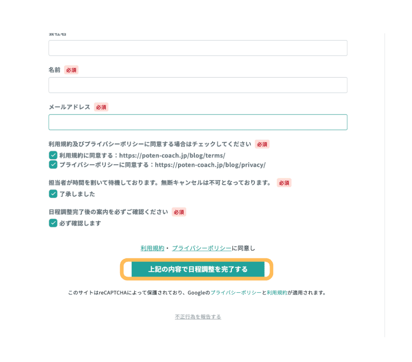 - STEP.3名前やメールアドレスなど必須項目を入力し【上記の内容で日程調整を完了する】をクリックします。