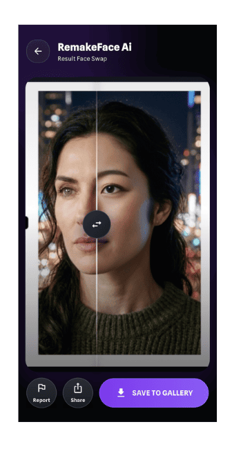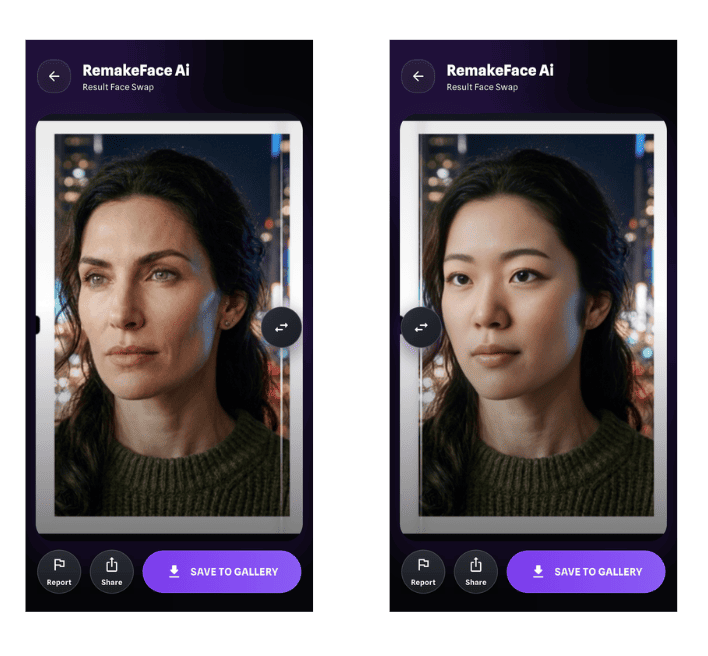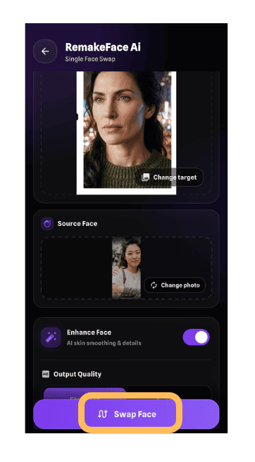 RemakeFaceのメイン機能は、写真の顔を別の顔に置き換えるフェイススワップです。