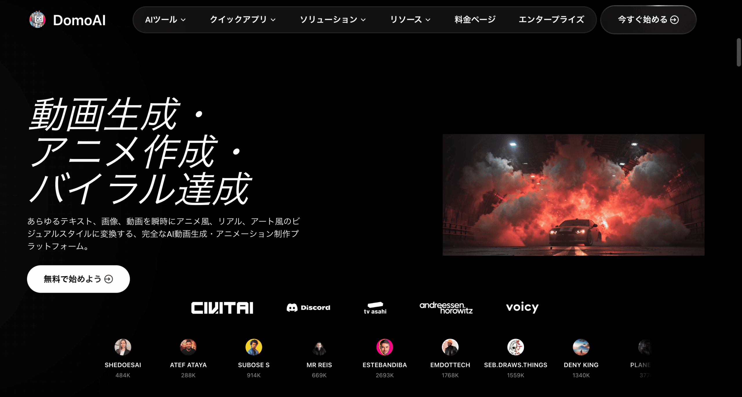 静止画からアニメーション、動画からスタイル変換、テキストから動画生成までをワンストップで実現。 300万人以上のクリエイターが支持し、初心者〜プロまで幅広く活用されています。