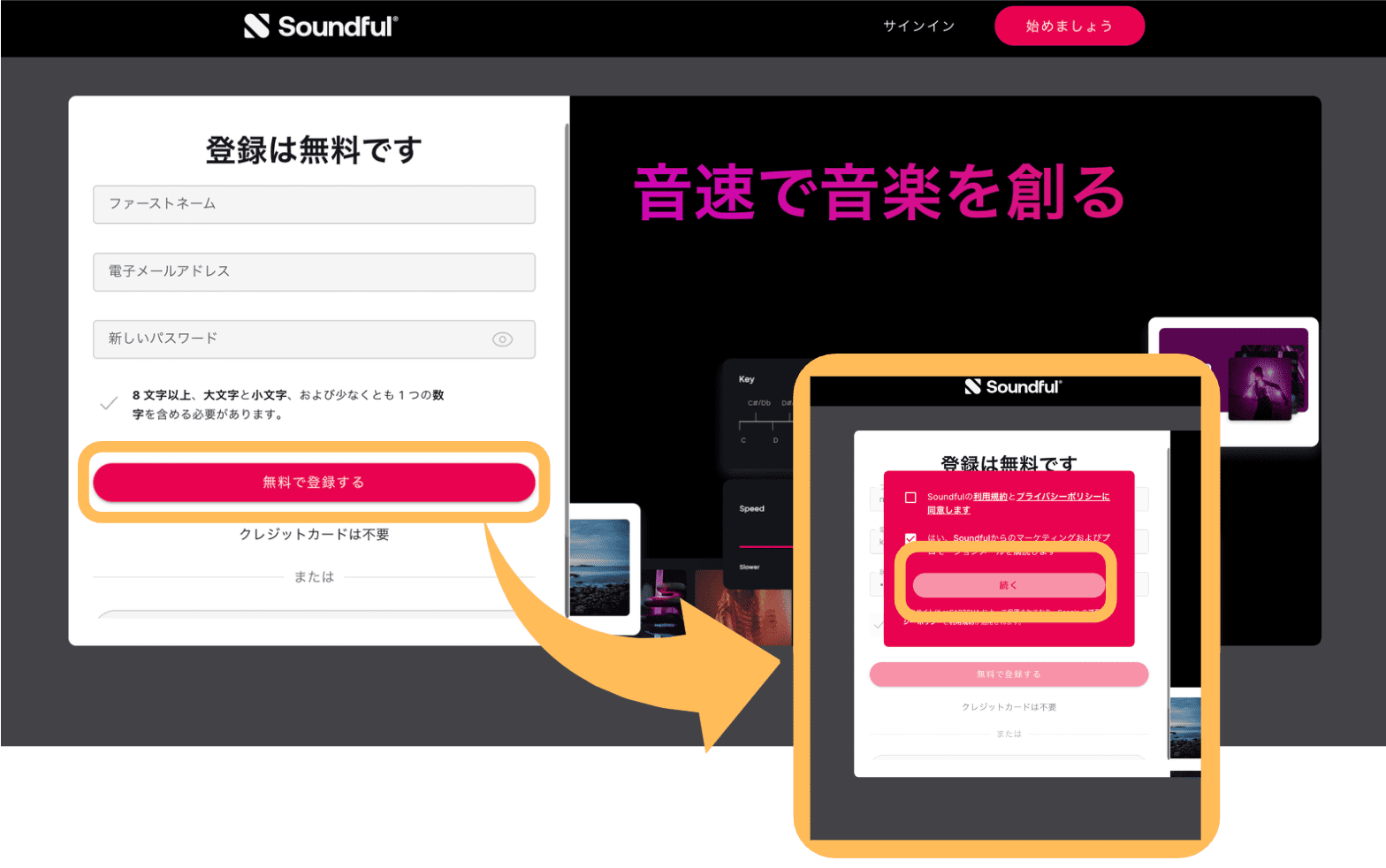 Soundfulのサイトにアクセスし【無料で始める】をクリックします。