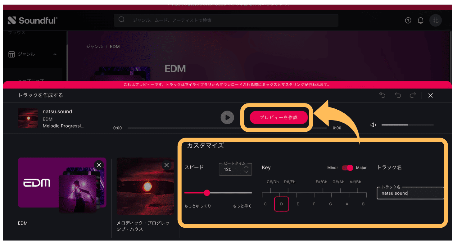 カスタマイズでスピードやキー、トラック名などを変更し【プレビューを作成】をクリックしますすれば数秒で音楽が生成されます。